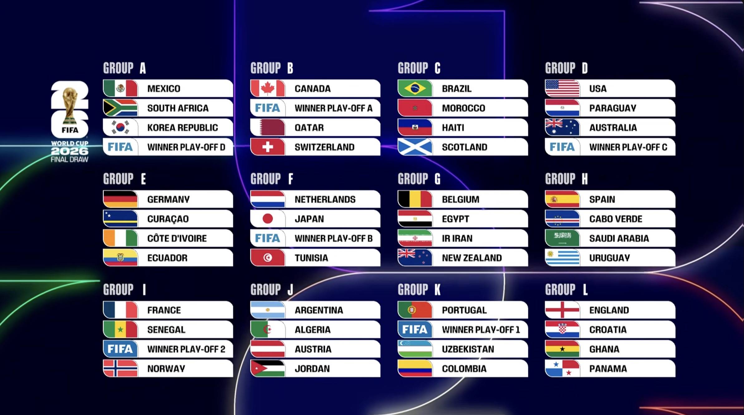 据央视新闻消息,当地时间12月5日,2026年美加墨世界杯决赛阶段抽签仪式在美国首都华盛顿举行。最终抽签结果如下: