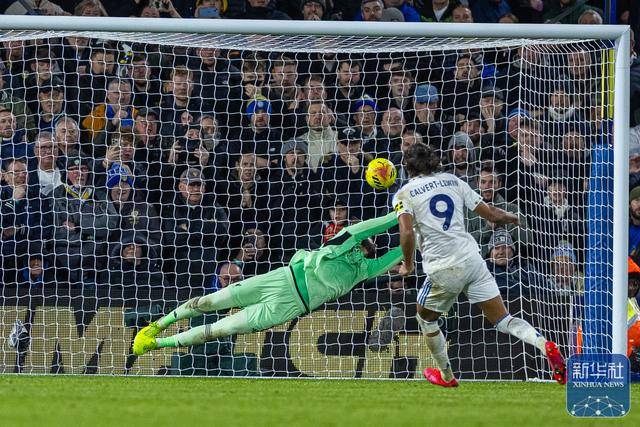 ↑ 利物浦队门将阿利松(左)未能扑出利兹联队球员勒温的点球。